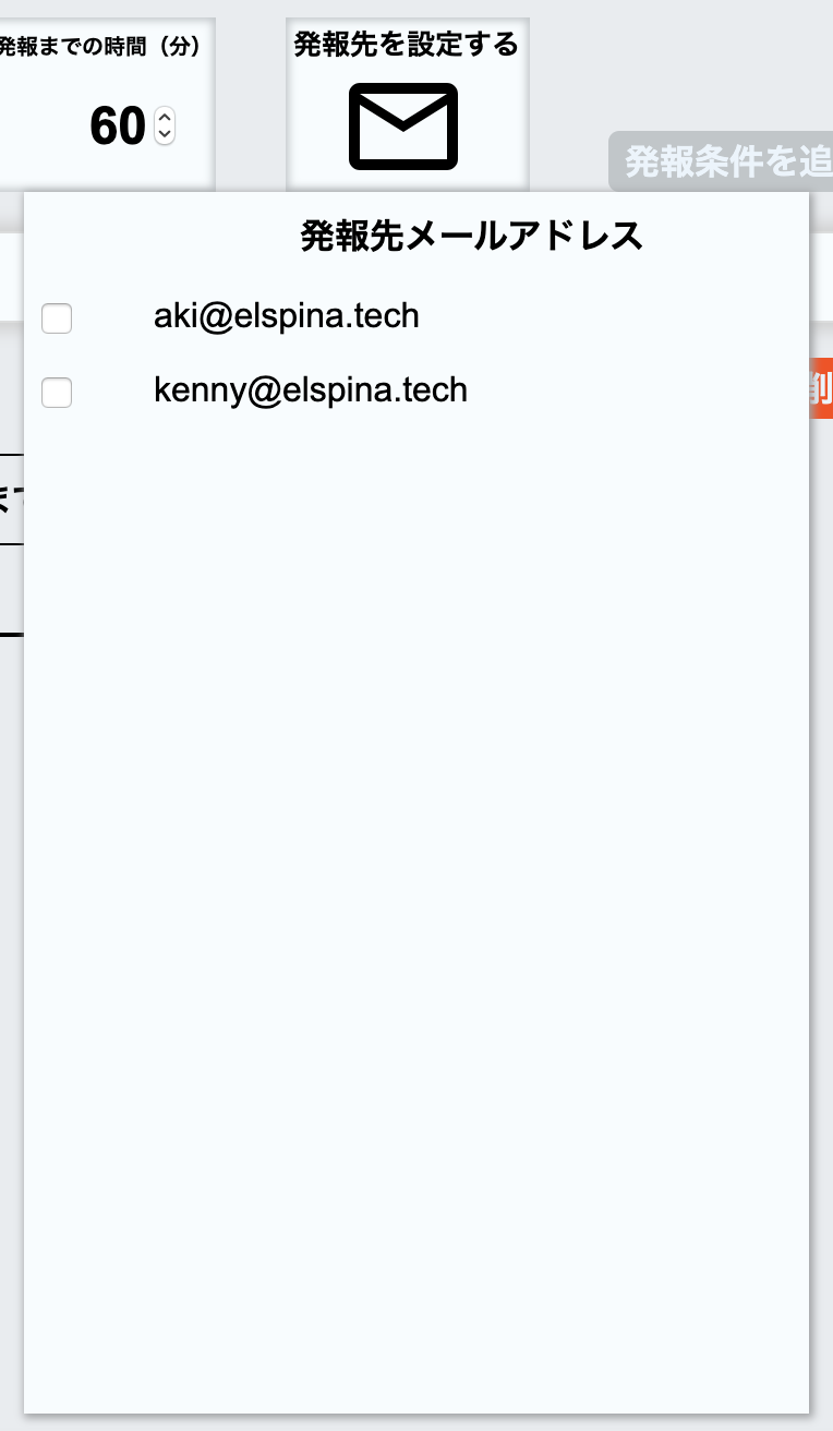 発報条件に紐付ける発報先を設定します(下図.メールのアイコンをクリックすると発報先のリストが開きます).