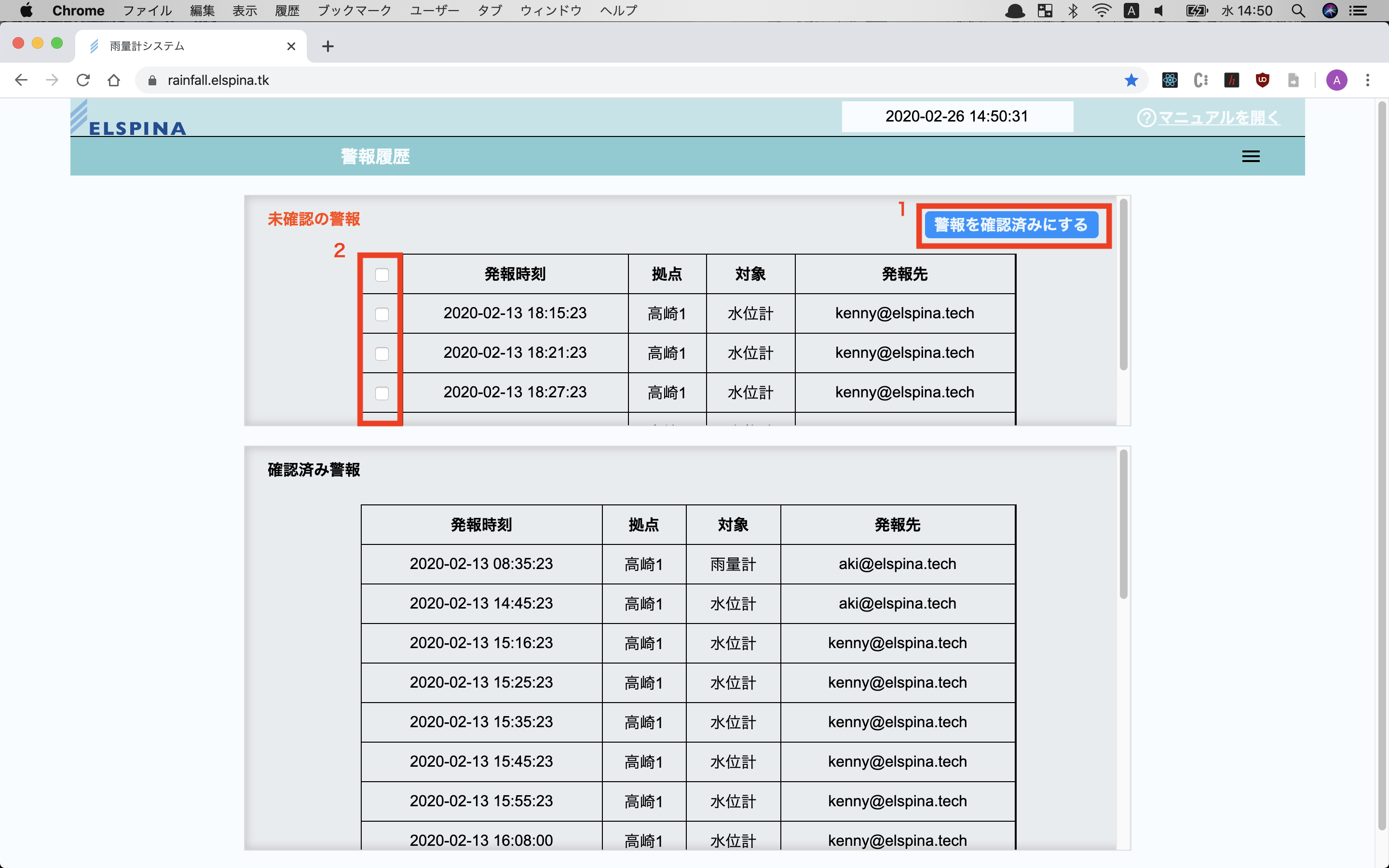 2 で確認する警報をチェックし, 1 をクリックすると警報が確認済みになります.