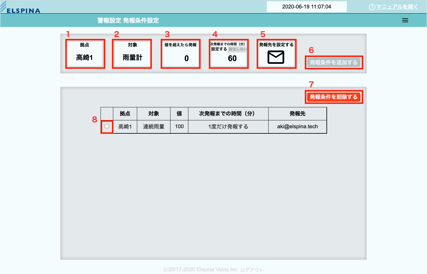 8 で削除する発報条件をチェックし, 7 をクリックすると発報条件が削除されます.
