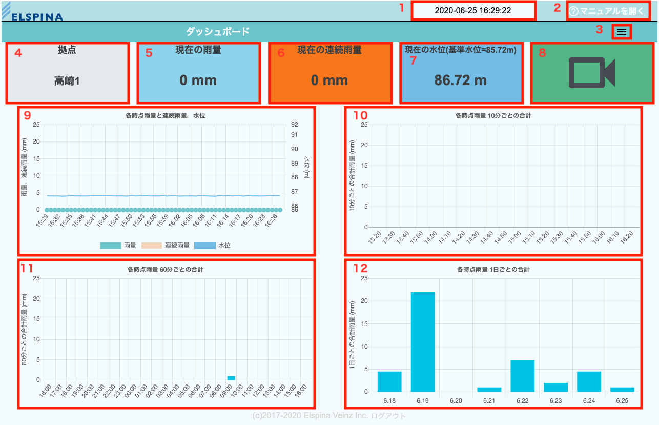 それぞれ,1分ごとの雨量・連続雨量・水位のトレンド(過去1時間),10分ごとの雨量の集計値(過去3時間),60分ごとの雨量の集計値(過去1日),1日ごとの雨量の集計値(過去1週間)を表示します.