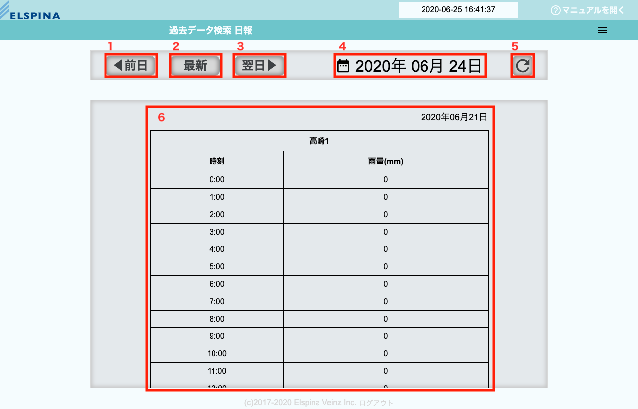 クリックすると,指定した日付のデータを取得し,6の領域に表示します.