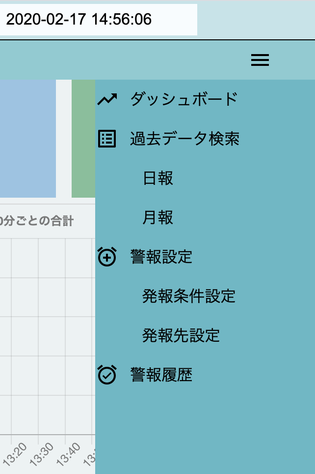 このメニューから,「ダッシュボード」「過去データ検索(日報)」「過去データ検索(月報)」「警報設定(発報条件設定)」「警報設定(発報先設定)」「警報履歴」の各画面へと遷移することができます.