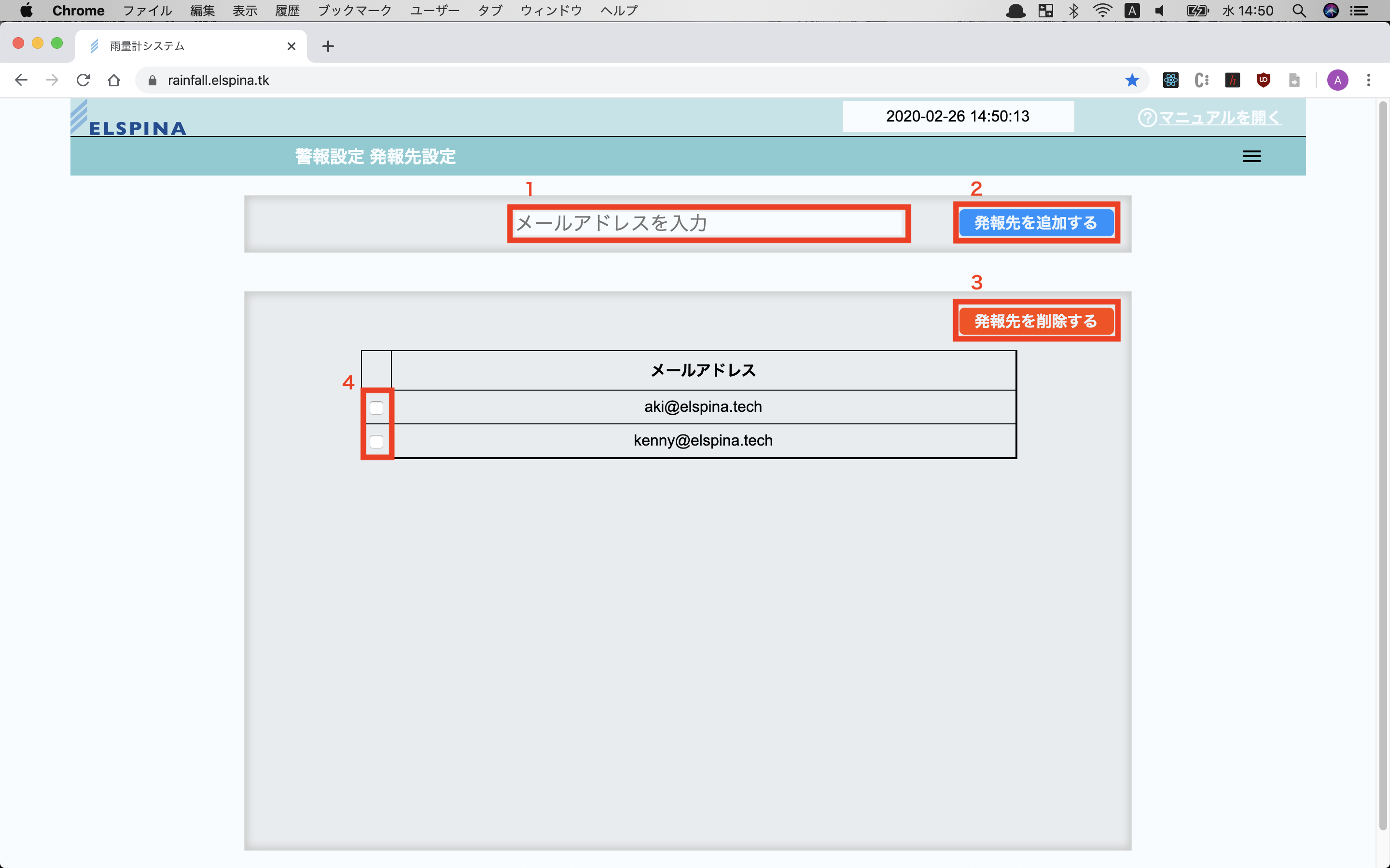 4で削除する発報先をチェックし, 3をクリックすると発報先が削除されます.